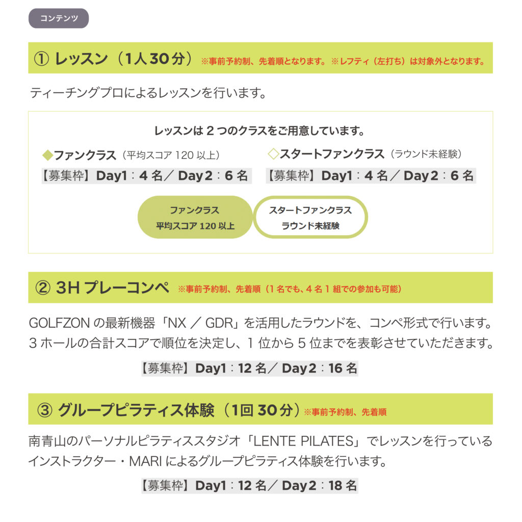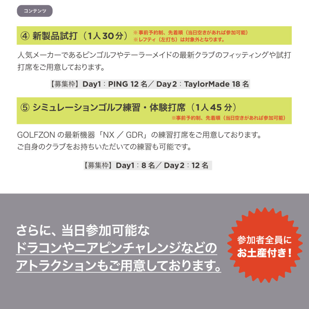 また、2日間それぞれの日程にて、人気ゴルフメーカーによる試打体験も実施予定️。